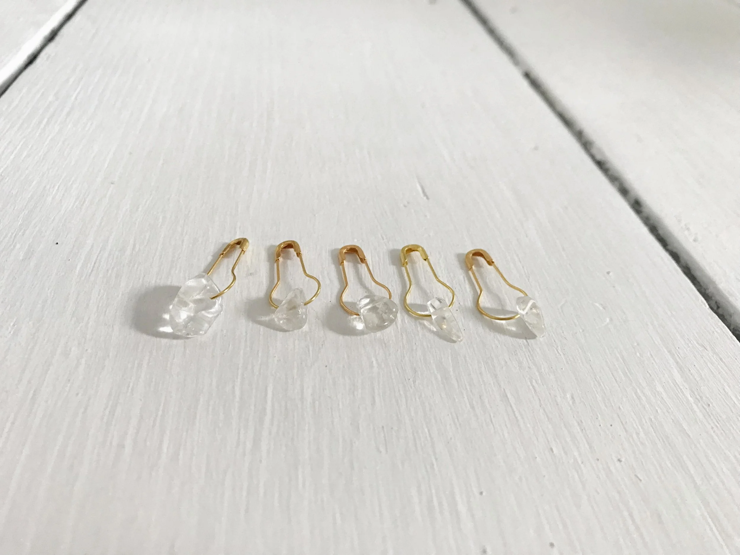 Clear quartz crystals and a gold bulb pin make the perfect stitch markers for your modern crochet or knitting project.